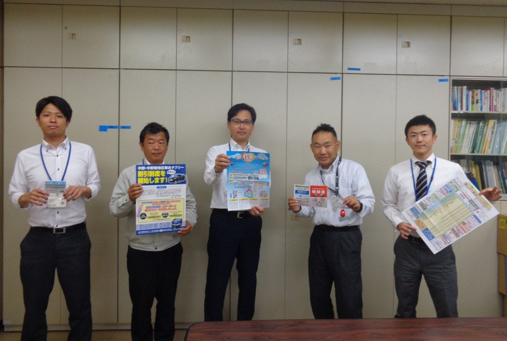 右から荒谷主事、兼藤専門員、石飛交通対策担当課長、水津主任技師、前主事。手にしているのは乗合タクシーに関連したチラシやグッズ。(広島市役所にて)