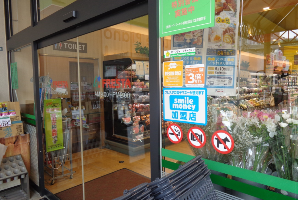 やぐちおもいやりタクシーの停留所があるフレスタ口田南店。口田地区乗合タクシーでは、協賛施設を利用した場合(商業施設は1,500円以上買物した場合)に、当日のみ使用可能な運賃100円割引券を発行している。自動扉横に貼ってあるオレンジ色のステッカーが協賛施設の目印。