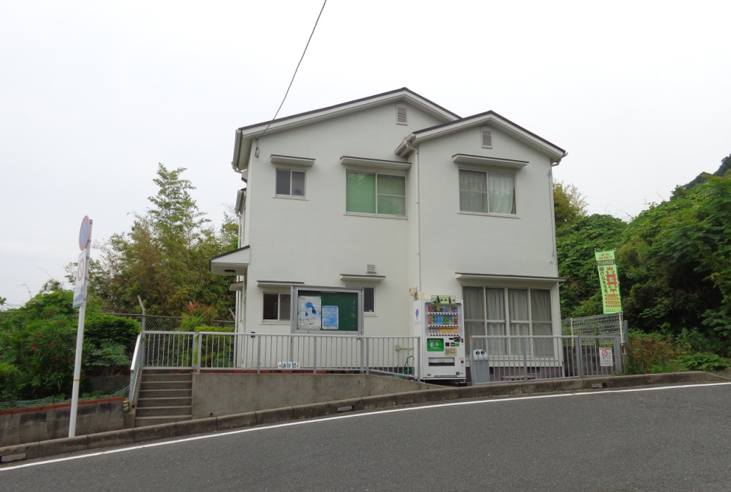 黄金山コミュニティ会館に設置されている乗合タクシー支援自動販売機。その収入を乗合タクシーの地元負担の一部に充てている。乗合タクシーに乗らない人でも、飲料の購入を通じて運行を支援できる仕組みになっている。