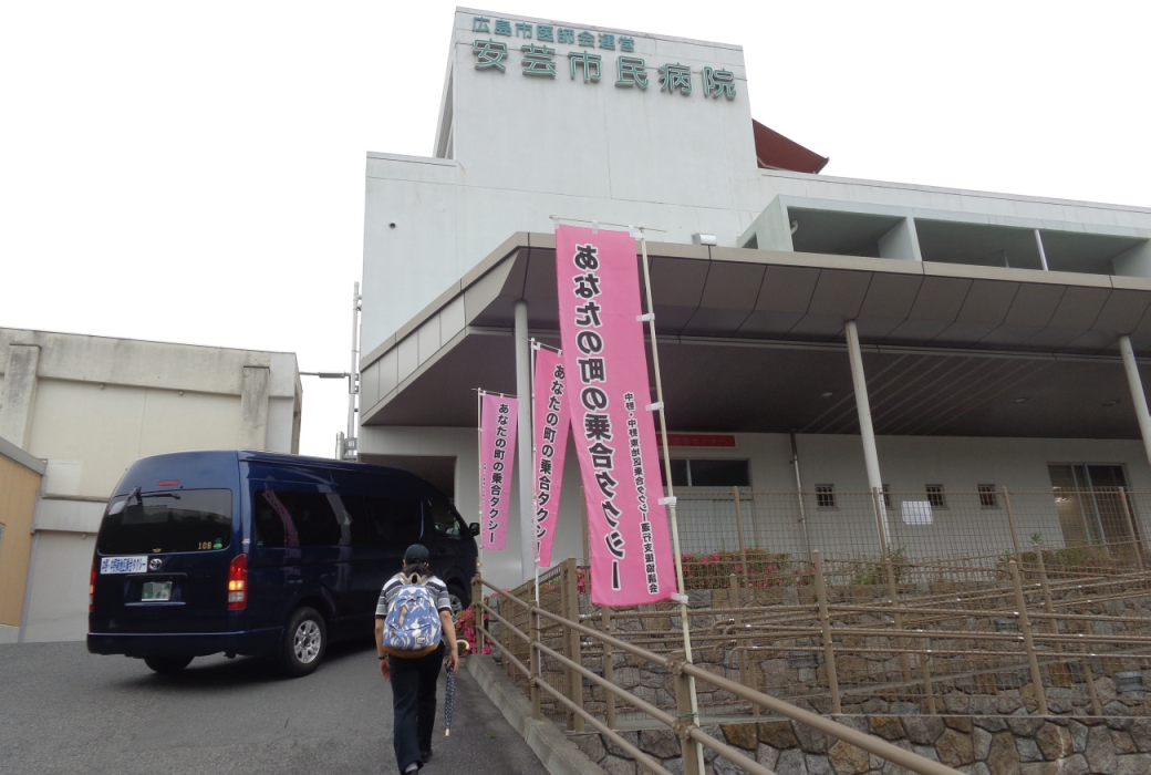 安芸市民病院内の停留所へ向かう乗合車両。起点・終点である同病院には、「あなたの町の乗合タクシー」と書かれたのぼりがいくつもはためく。
