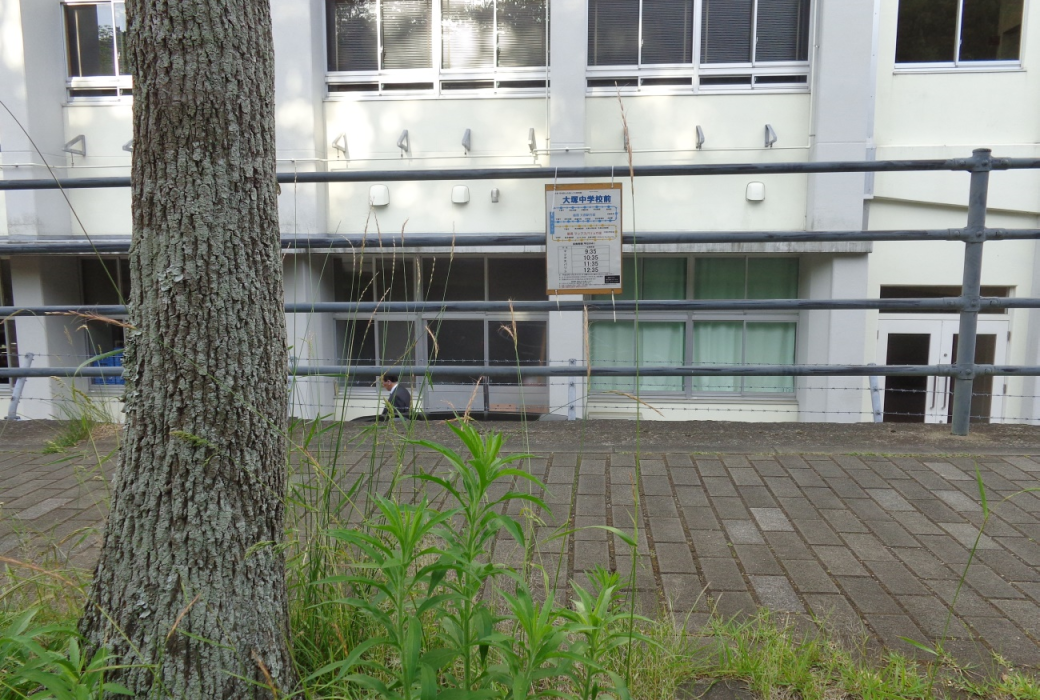 大塚中学校前の乗合停留所案内板。簡素なつくりであるが、時刻表はもちろん、ルート図も掲載し、利用者が迷わないよう配慮されている。